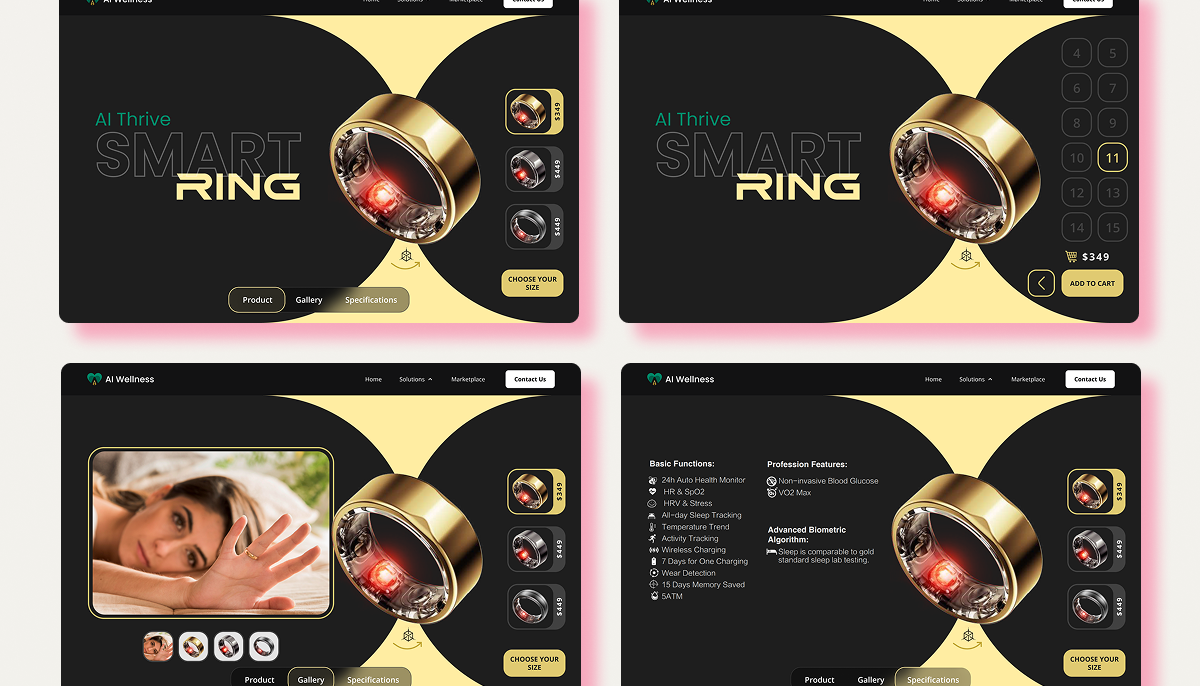 Developed a dynamic and visually rich product landing page for the AI Wellness smart ring, featuring custom-coded functionality, animated UI elements, and seamless eCommerce integration.